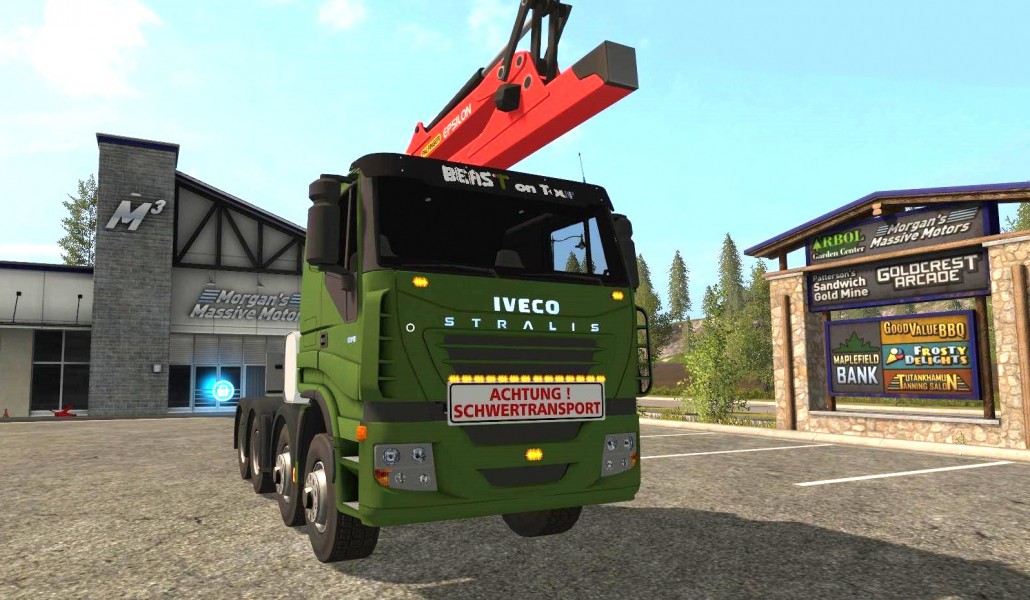 Iveco Stralis s manipulátorem - Max. výkon - 476 hp max. Rychlost - 81 km / h. Osvětlení, interiérová světla, rychloměr, tachometr, ukazatel stavu paliva, teplota, kontrolky a směrové signály, zrcadla, houpačka, operátor fotoaparátu, značky, prach, animace. Umývatelný.