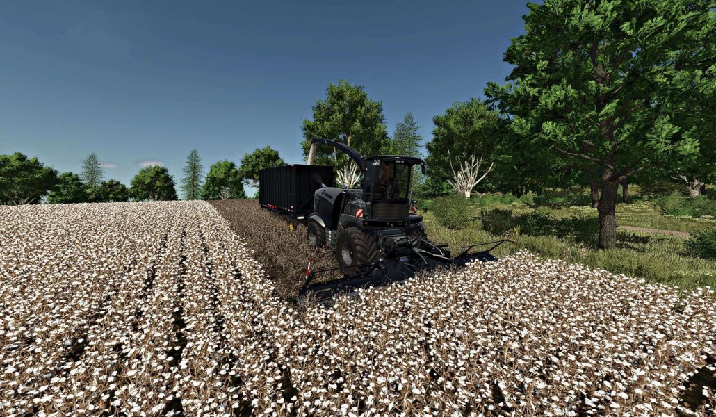 Pack for cotton cleaning, including a modernized Krone BIG X 1180 feed combine harvester, X-Collect 900-3 reaping and two spacious trailers: Randon Canavieiro and Krampe SB II 30/1070. Ideal for collecting and transporting loose cotton.